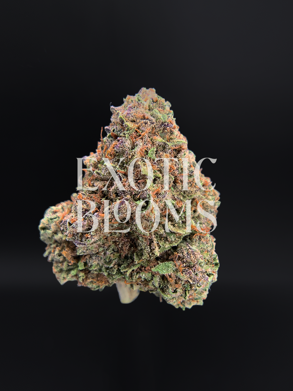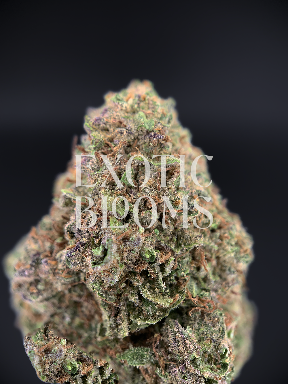 Appearance: Leafy, slightly airy cone-shaped dark olive-green buds with rich purple undertones, fiery orange pistils, and a heavy coating of frosty lavender trichomes