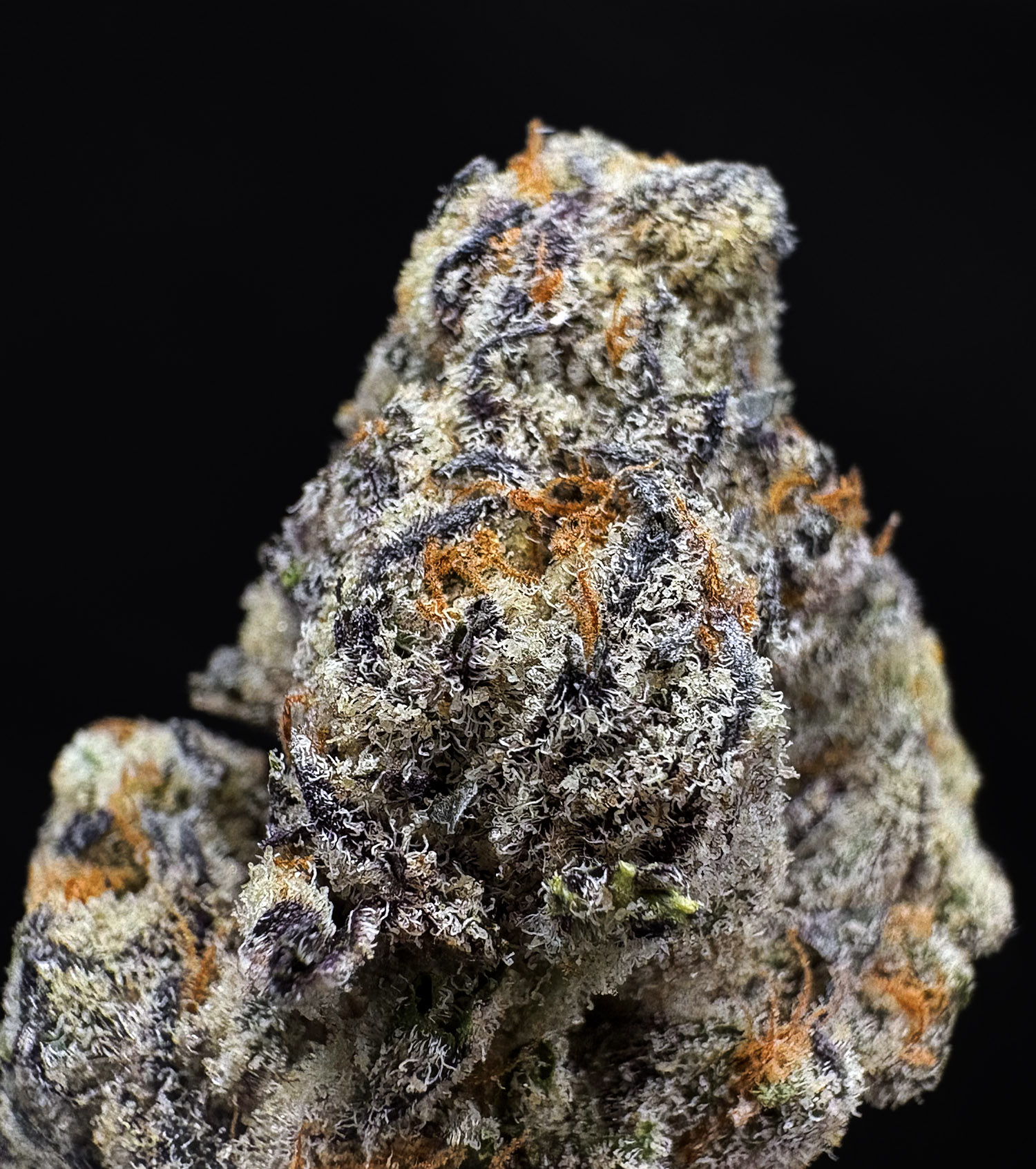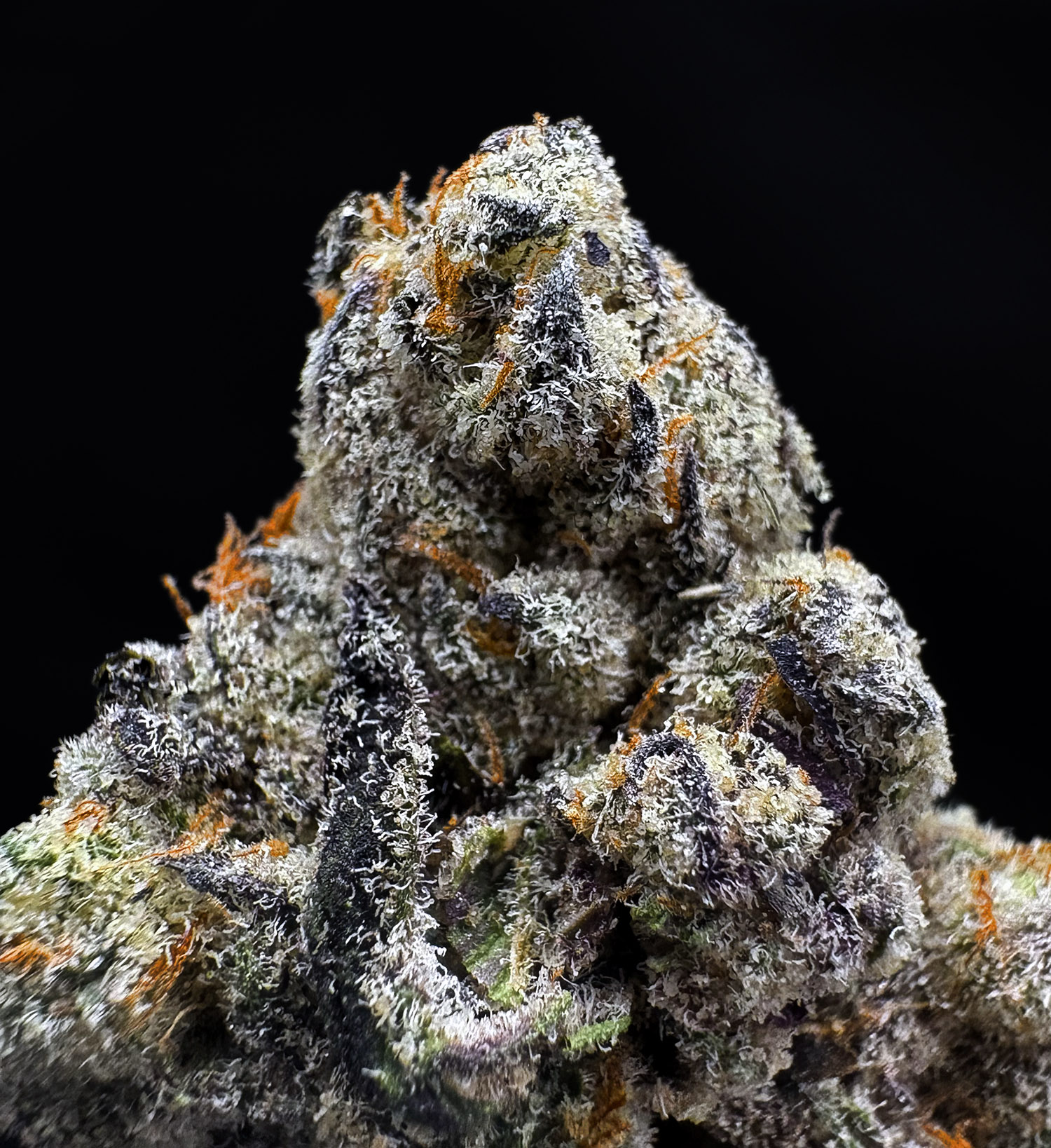 - Appearance: Green and blue-tinted buds, orange pistils, heavy trichome frost
