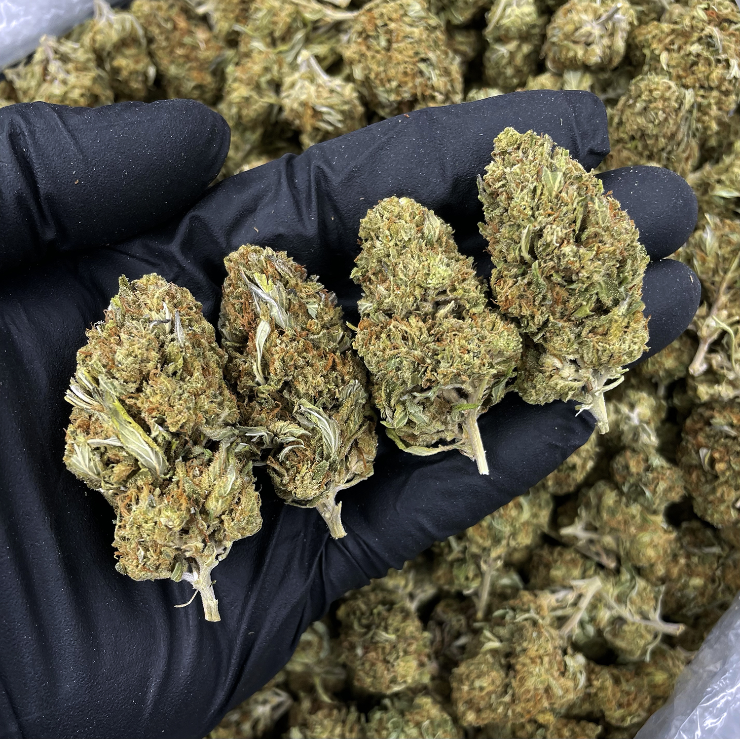 Appearance: Fluffy rounded dark olive-green buds, red-orange hairs, milky white trichomes
