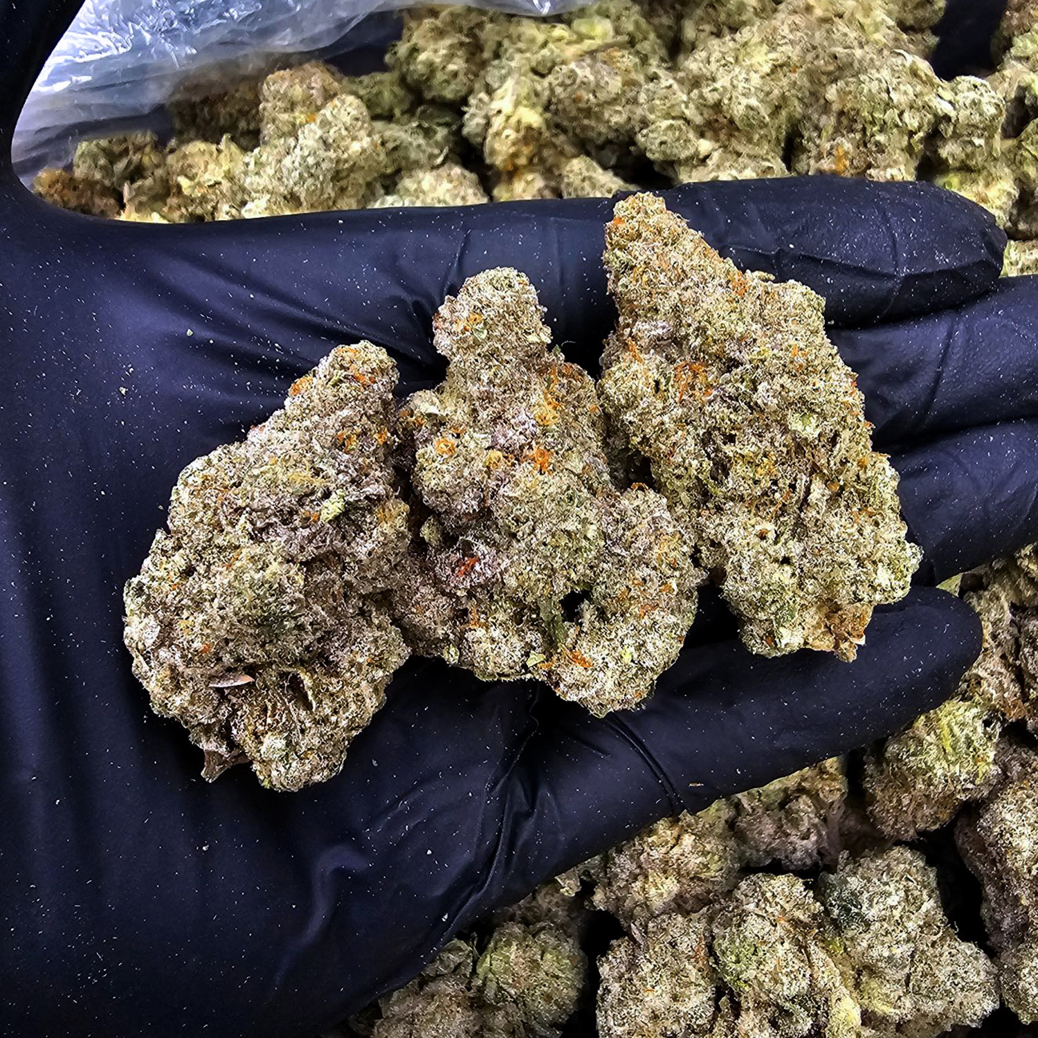 Appearance: Dense lime-green buds, orange pistils, heavy milky trichome coating