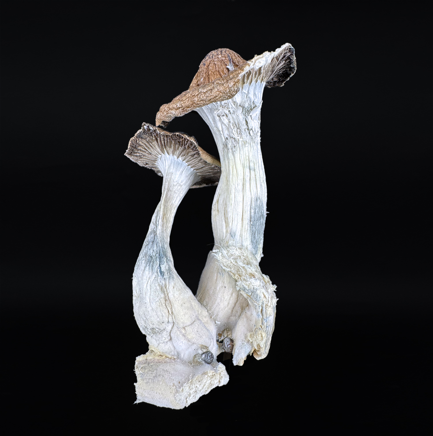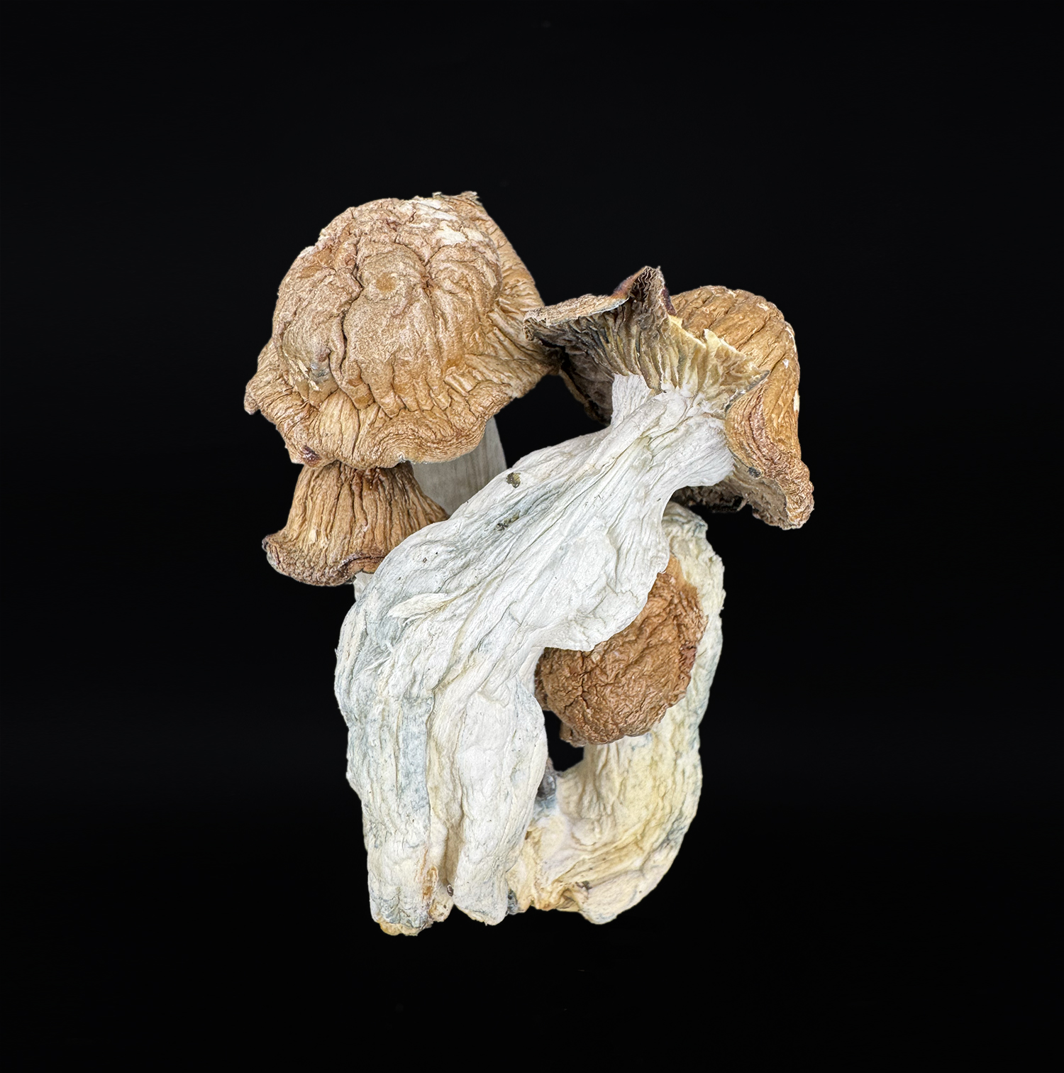 Appearance: Thick stems, PE-style morphology, dense tissue, distorted cap structure
