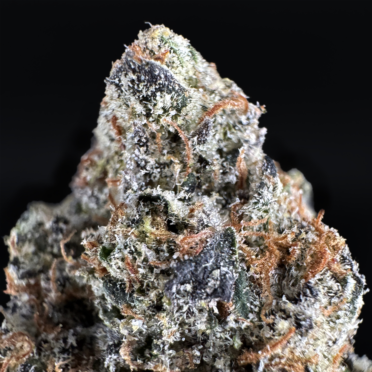 Appearance: Fluffy grape-shaped emerald-green buds with purple undertones, orange hairs, and frosty purple-tinted trichomes
