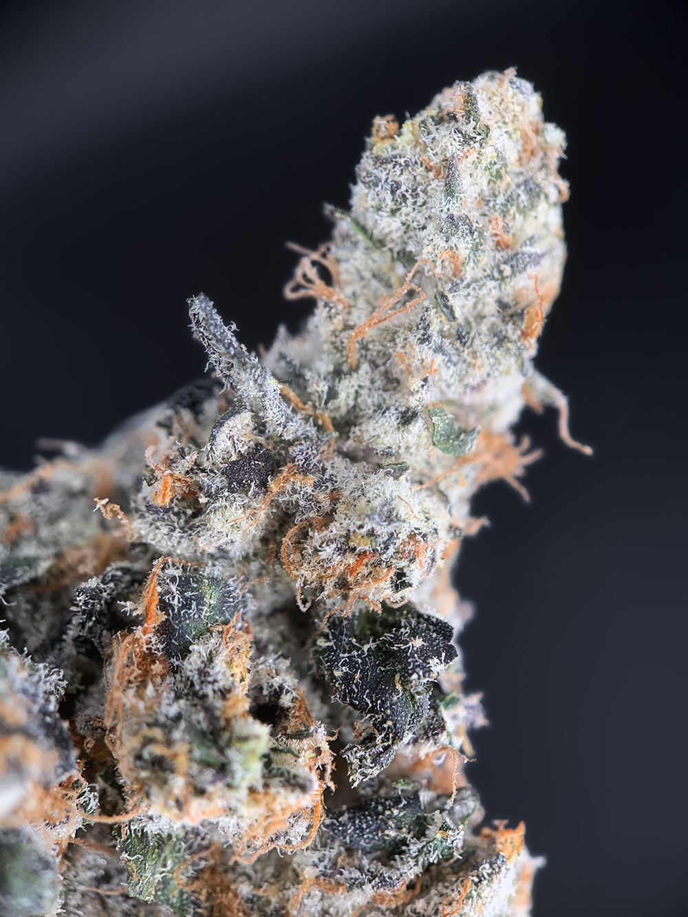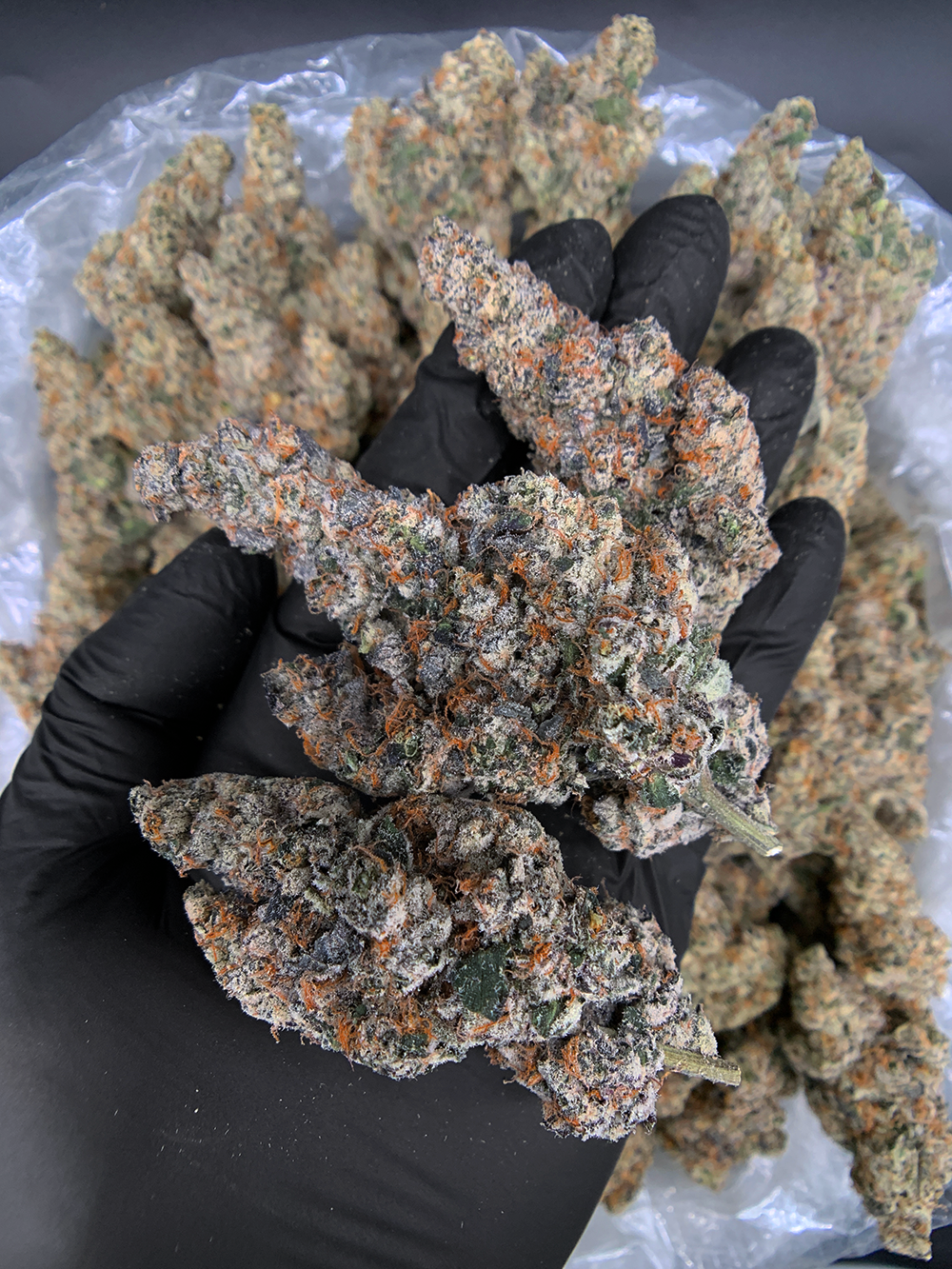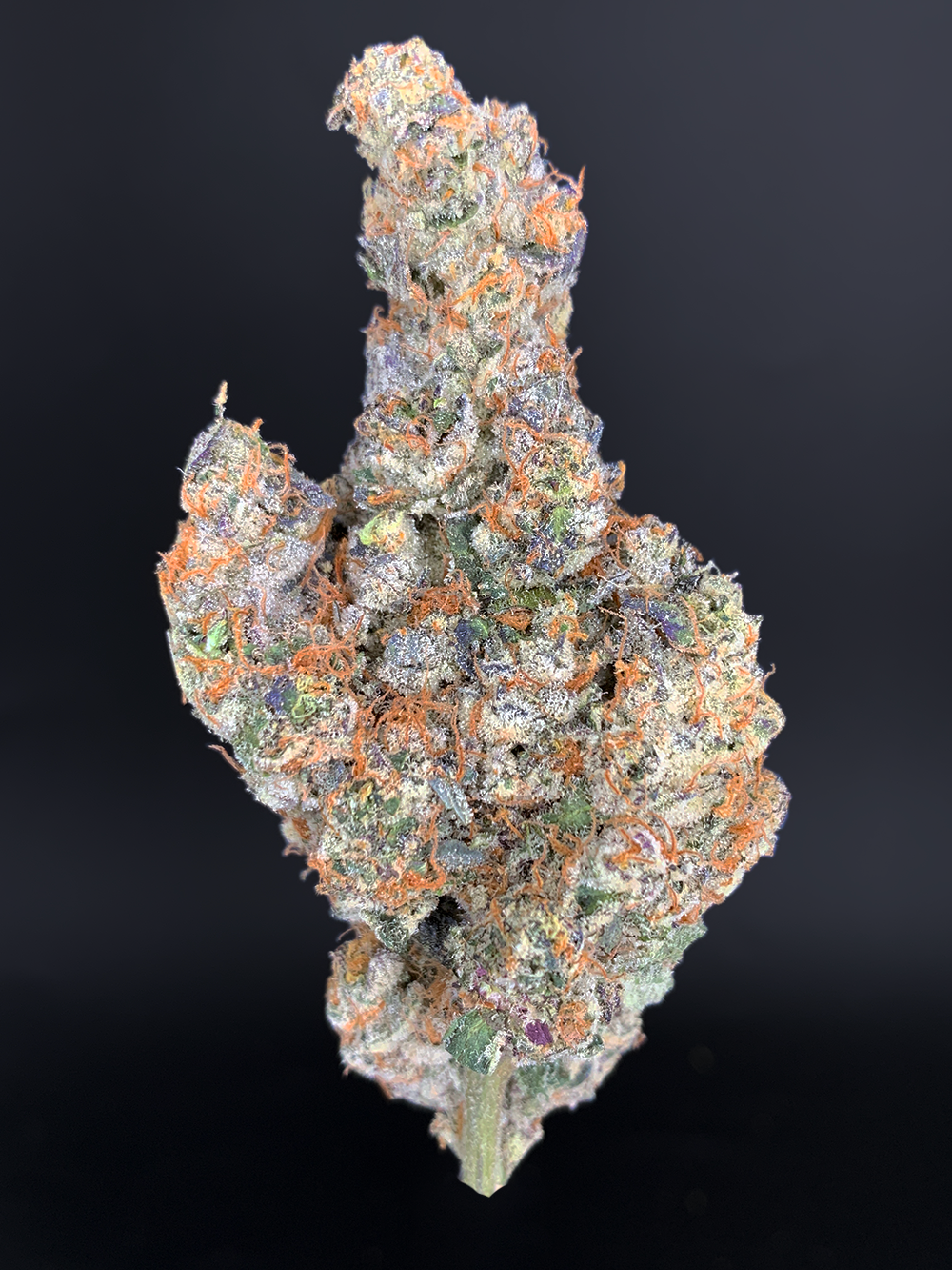 The buds themselves are a work of art: dense, frosted nugs streaked with deep violet hues and vibrant amber pistils that glisten under a blanket of resinous trichomes. There’s a palpable richness just in the way they feel — sticky, textured, and heavy with promise.