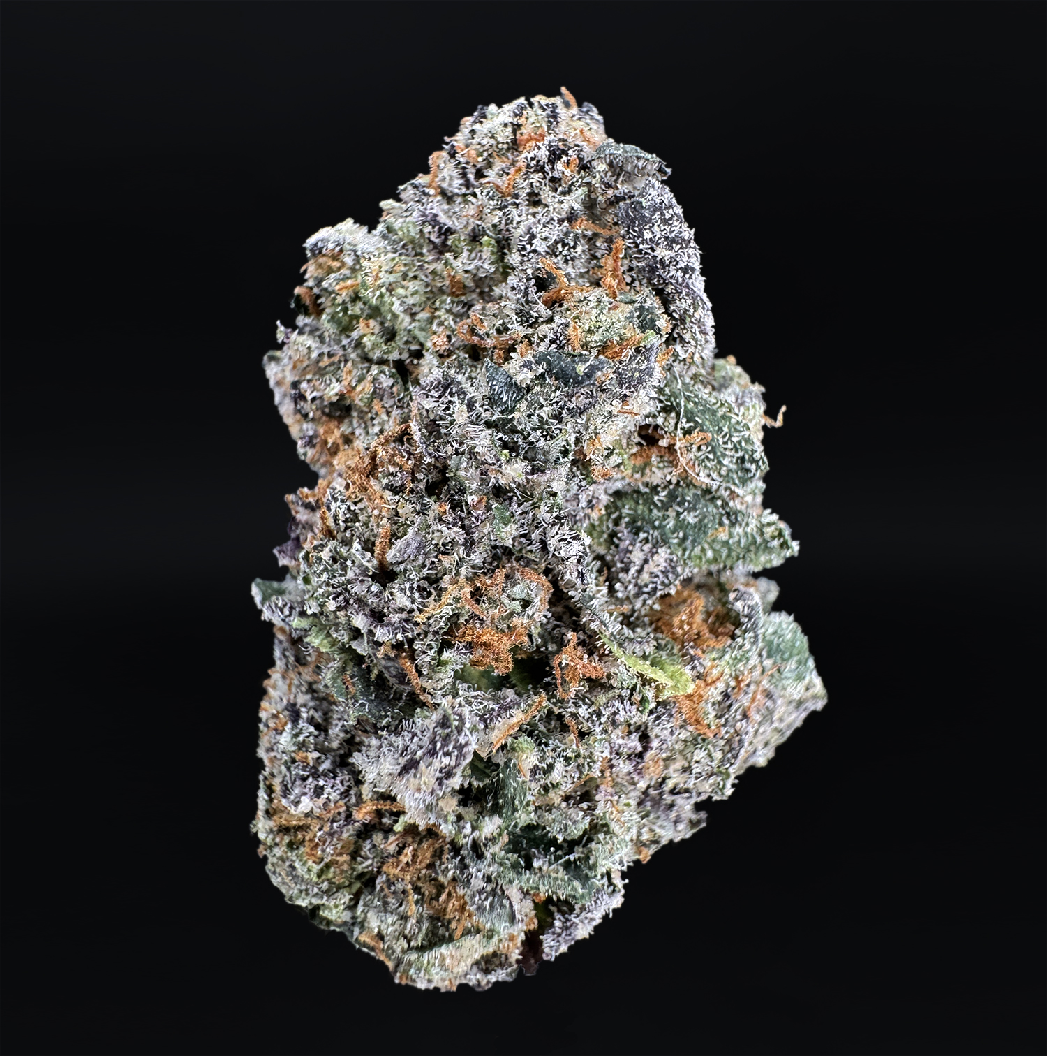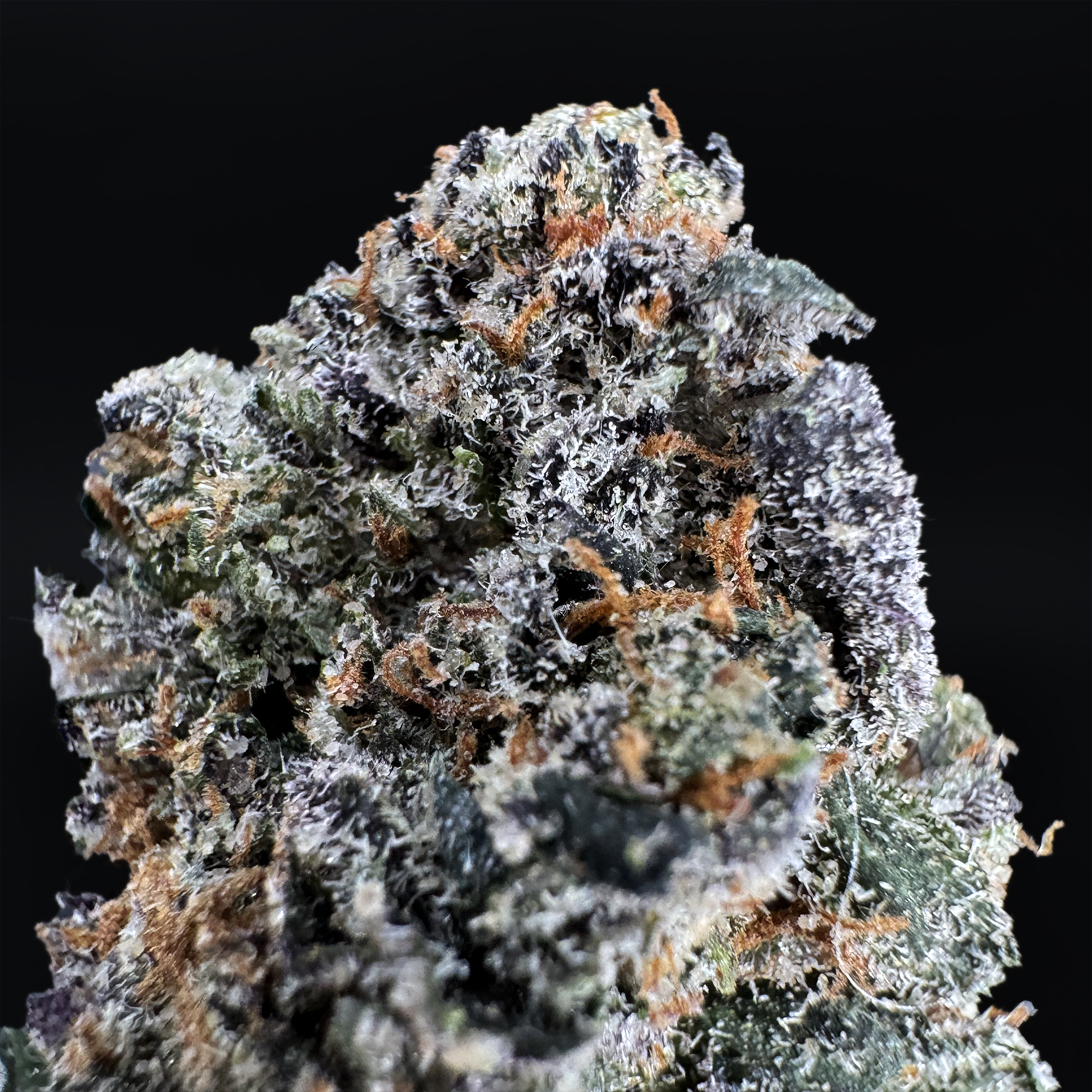 Appearance: Grape-shaped emerald buds, deep purple undertones, orange pistils, dense bright-white trichomes