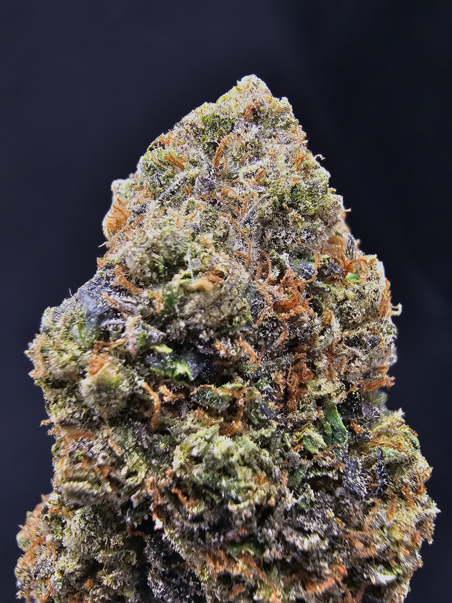 Appearance: Dense, sparkling buds coated in a thick, frosty blanket of trichomes, giving a crystalized, glowing look. Olive-green with fiery orange pistils woven throughout.