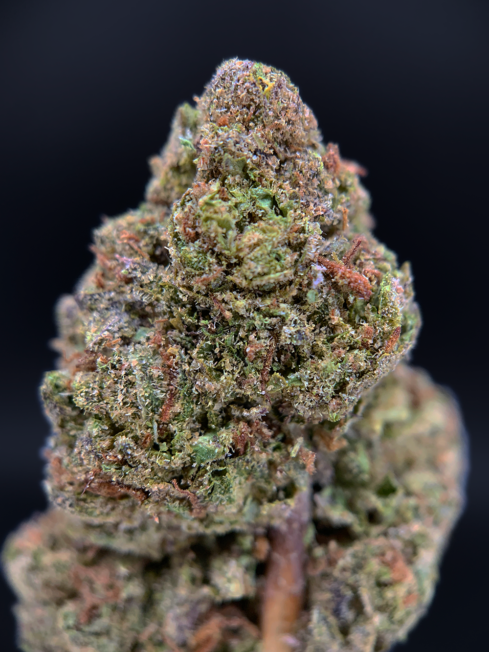 Appearance: Dense green buds with purple undertones, orange hairs, and a frost of milky trichomes