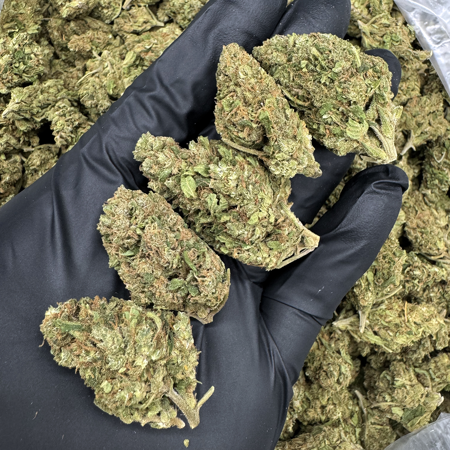 Appearance: Small, grape-shaped forest green buds with bright undertones, thin orange hairs, and a frosty coat of golden-white trichomes