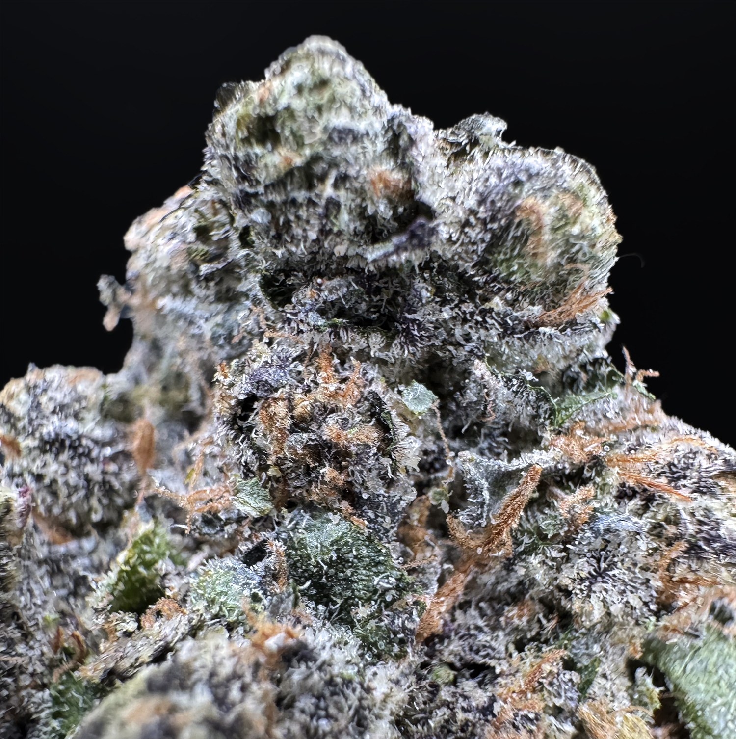 Appearance: Fluffy, tapered forest-green buds with mint undertones, thin orange hairs, and golden-amber frosty trichomes