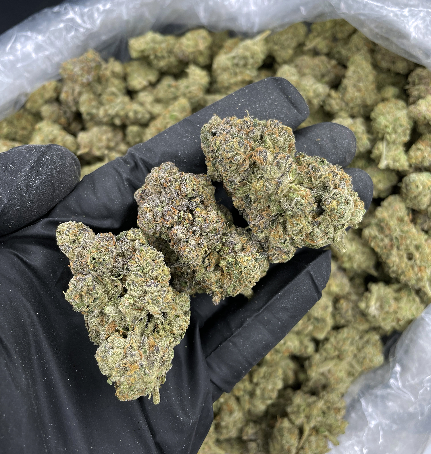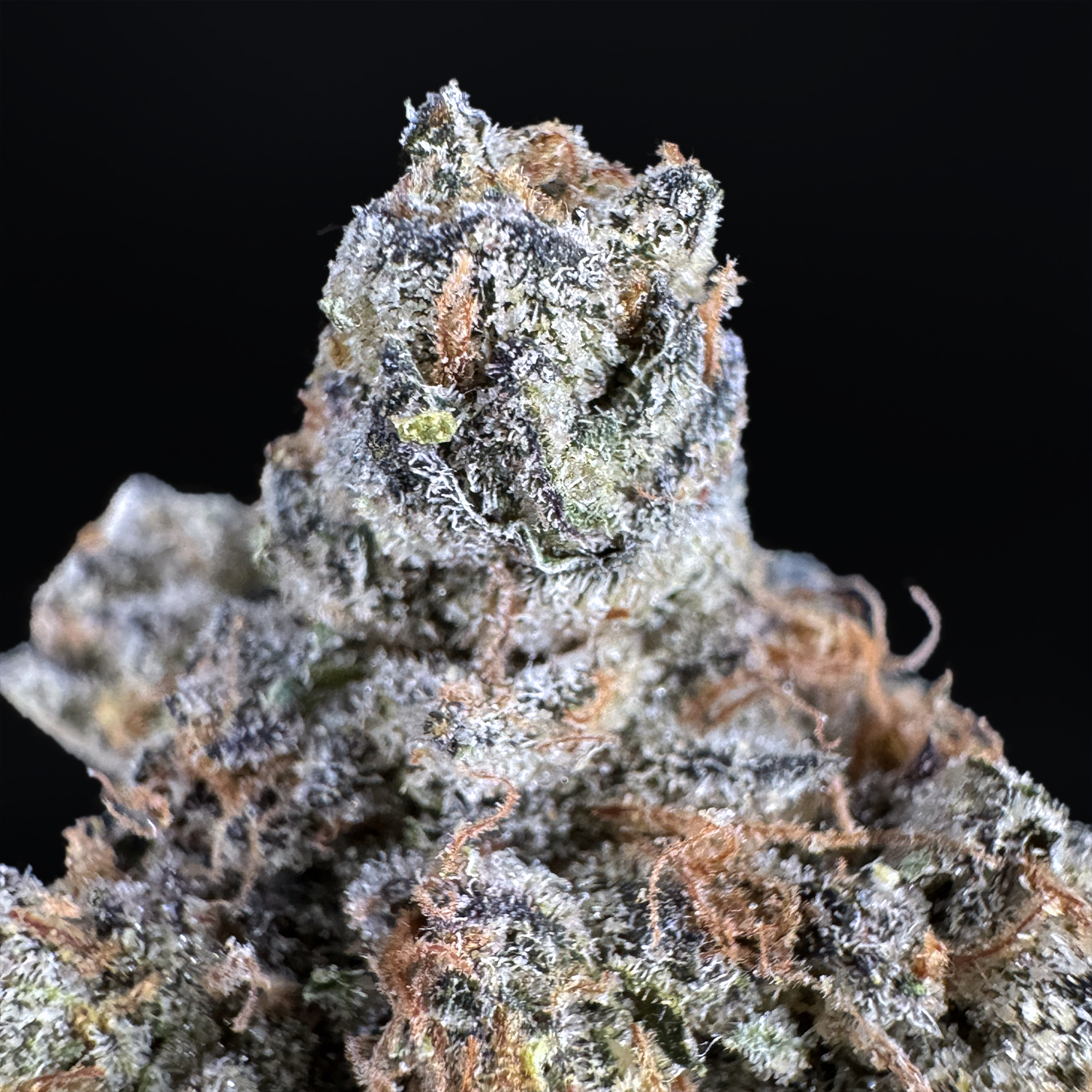 Appearance: Dense pepper-shaped dusty green buds, golden undertones, orange hairs, chunky white trichomes