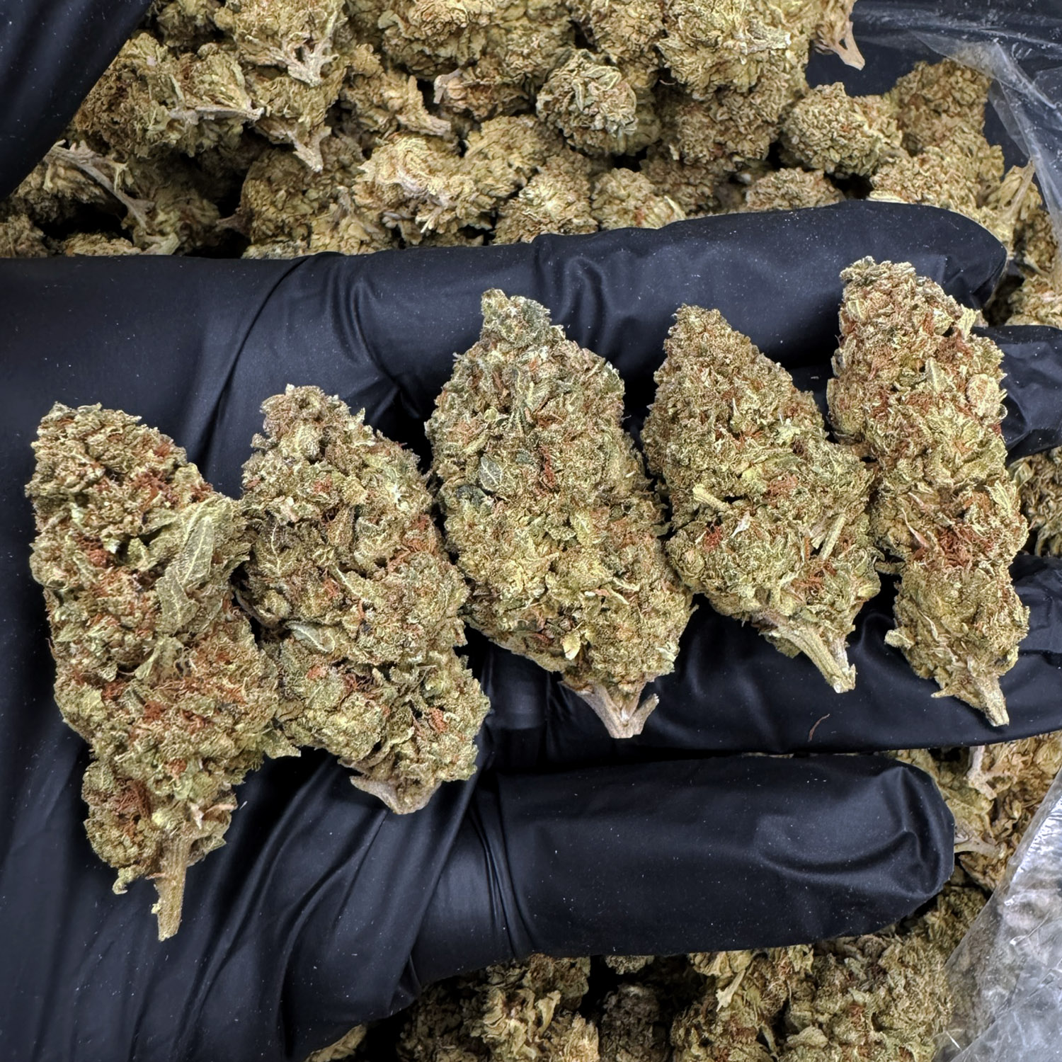 - Appearance: Dense rounded buds, deep green with purple hues, bright orange hairs, frosty trichomes