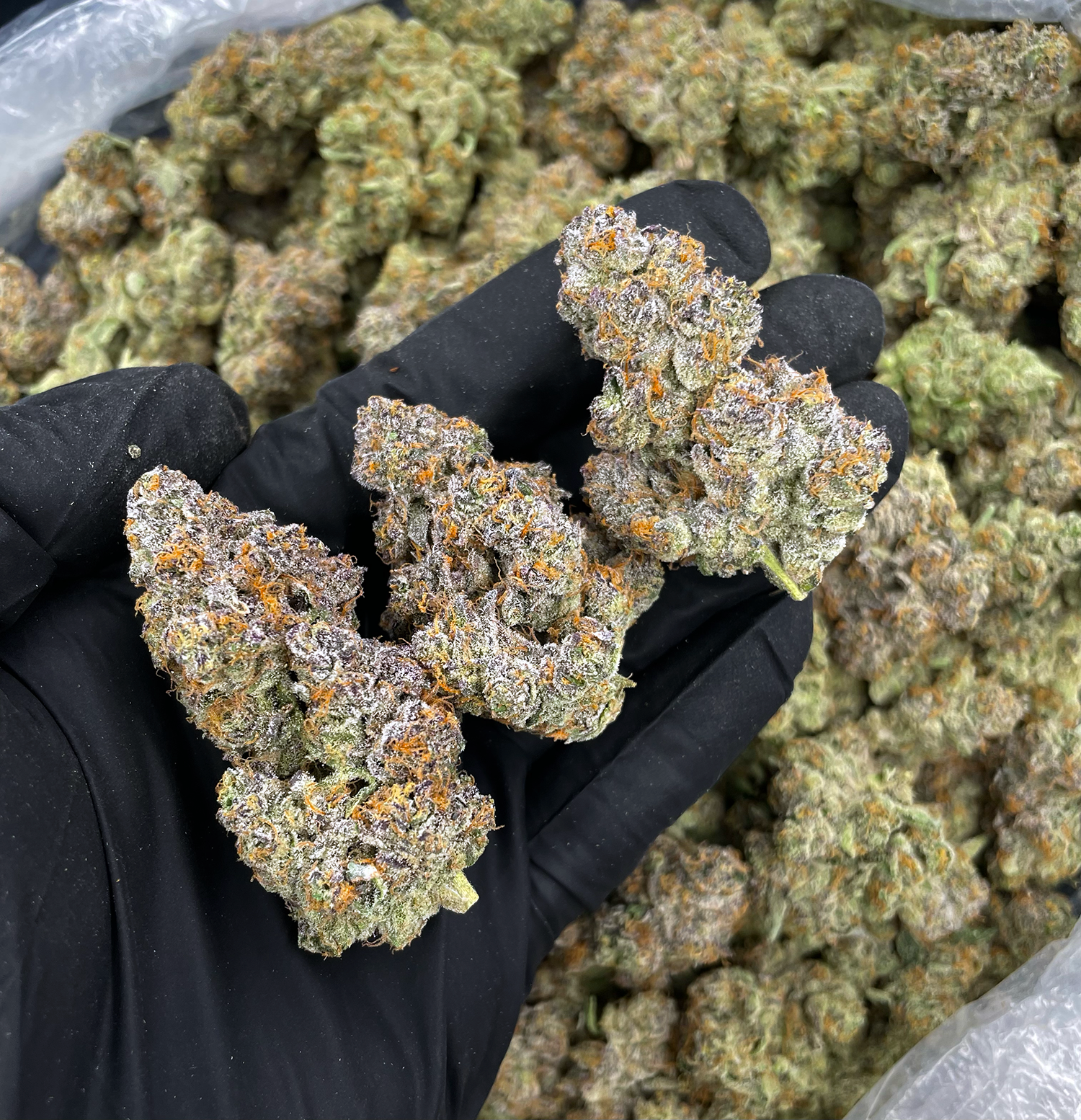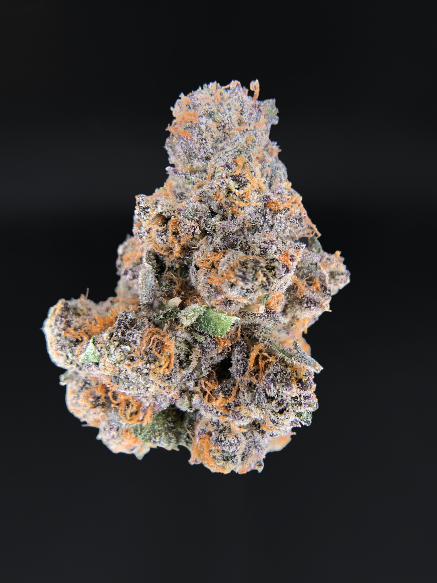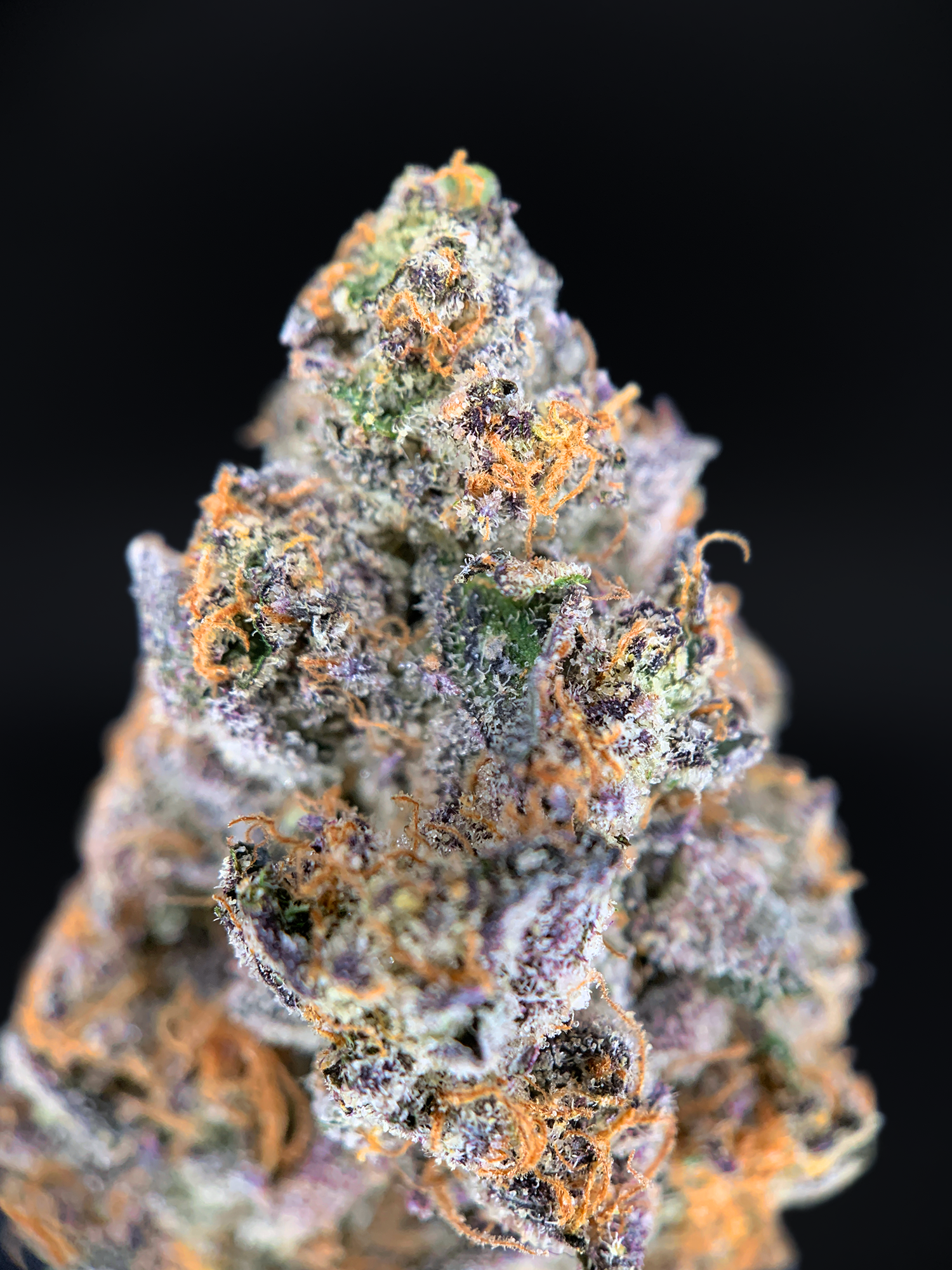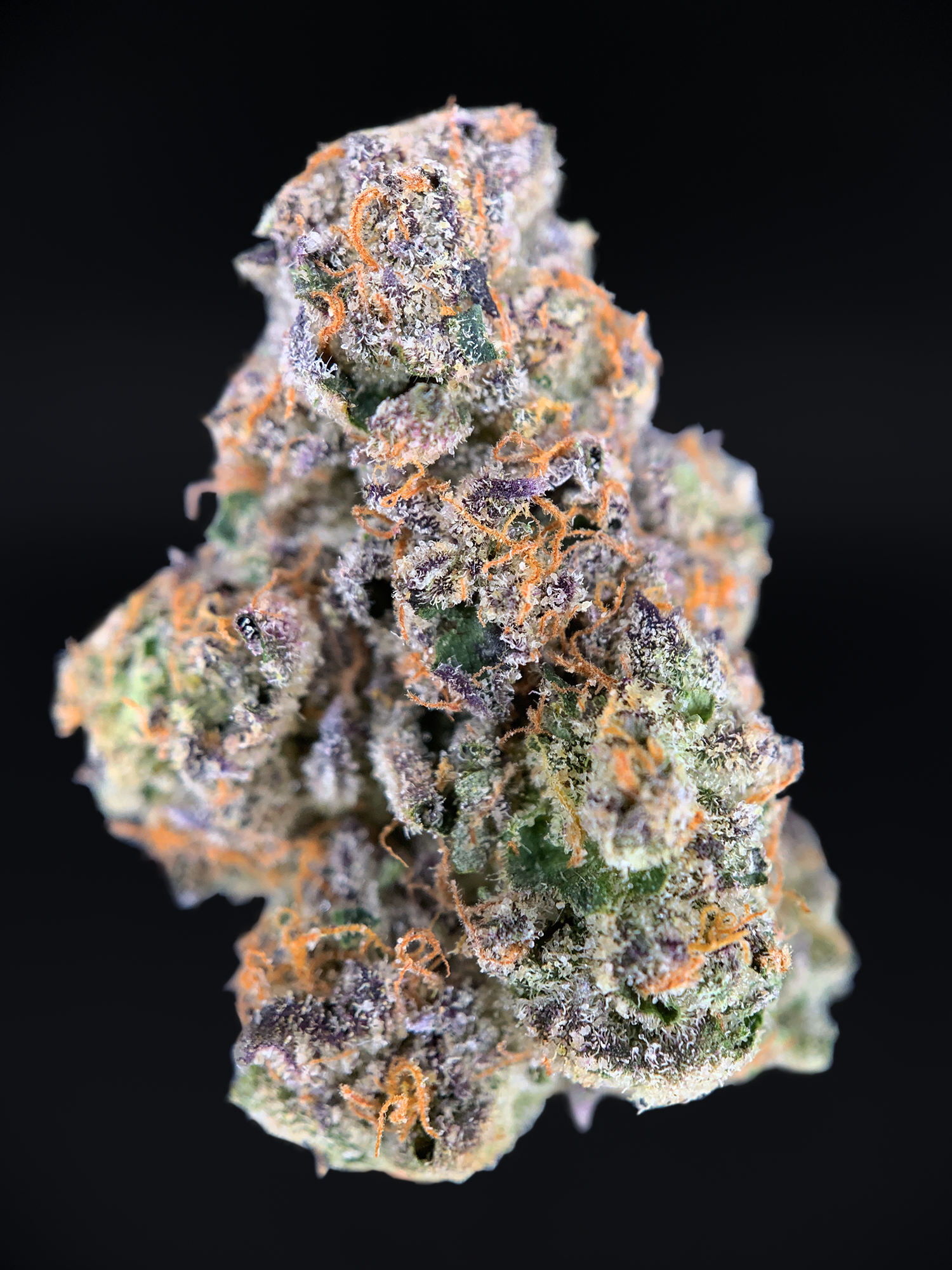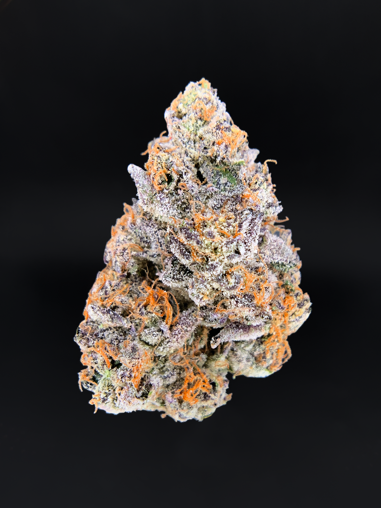 Appearance: Oversized olive-green nugs with blue undertones, thick orange hairs, heavy frosty trichome coverage