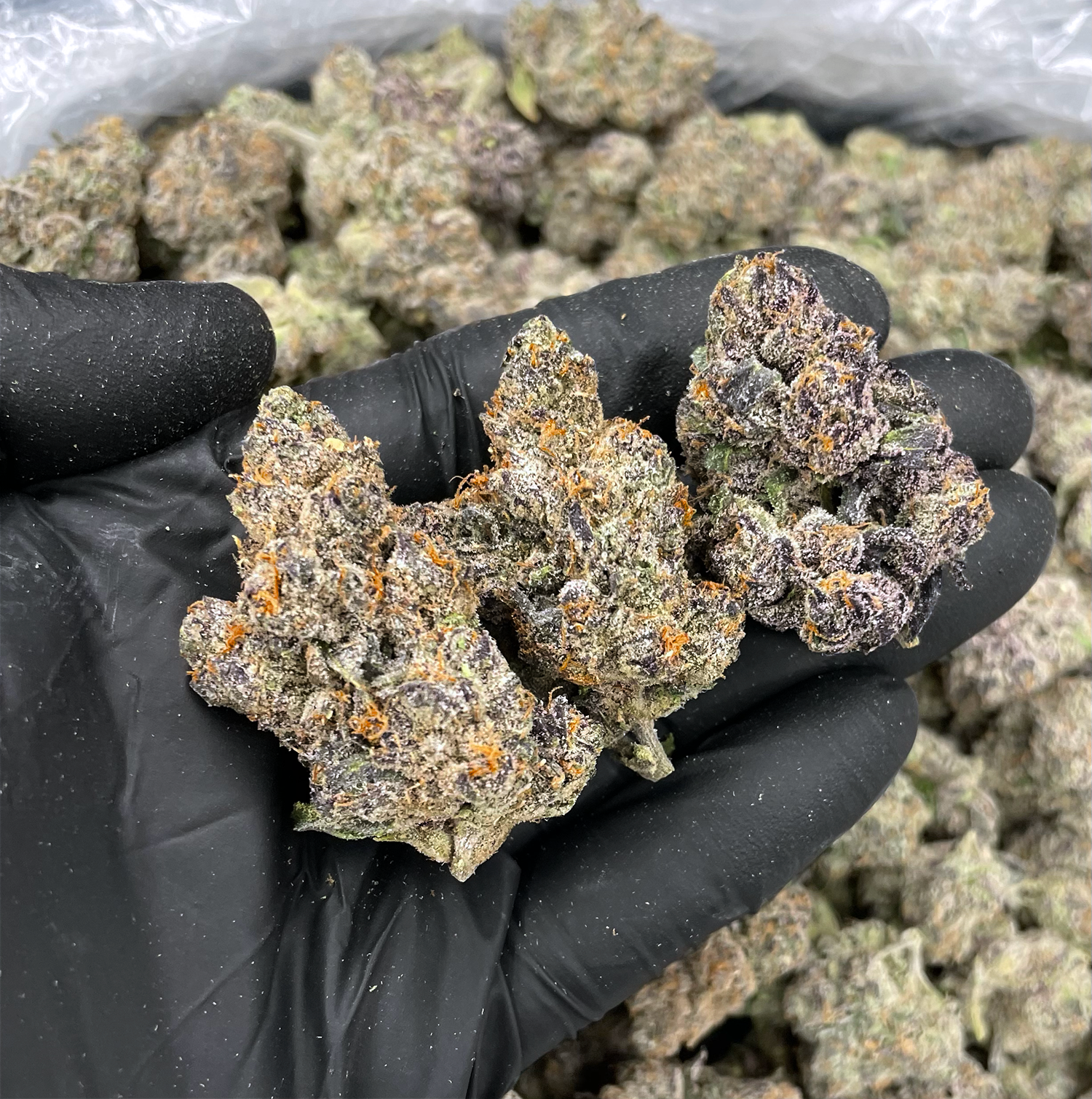 Appearance: Dark olive green buds, deep purple hues, amber hairs, milky trichomes
