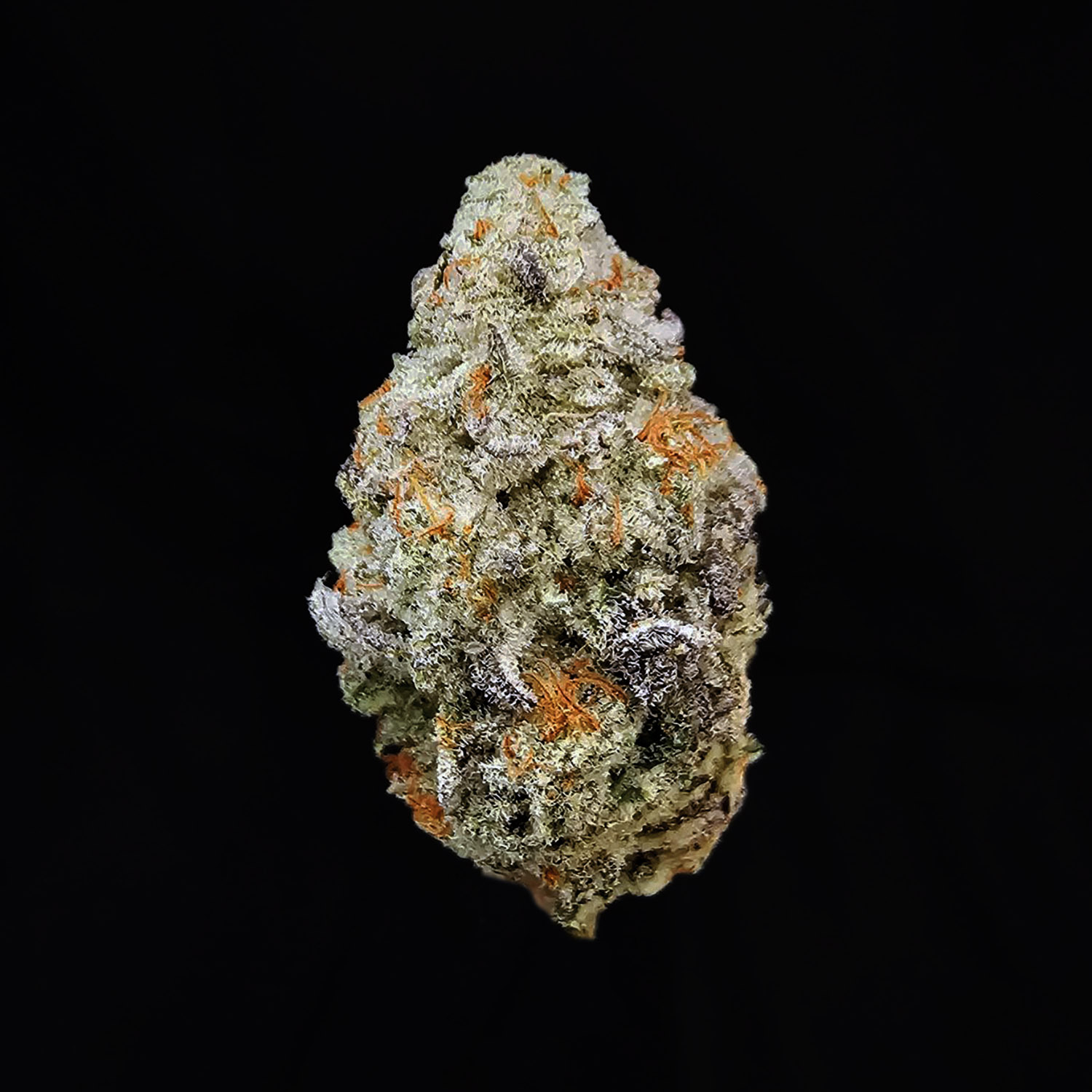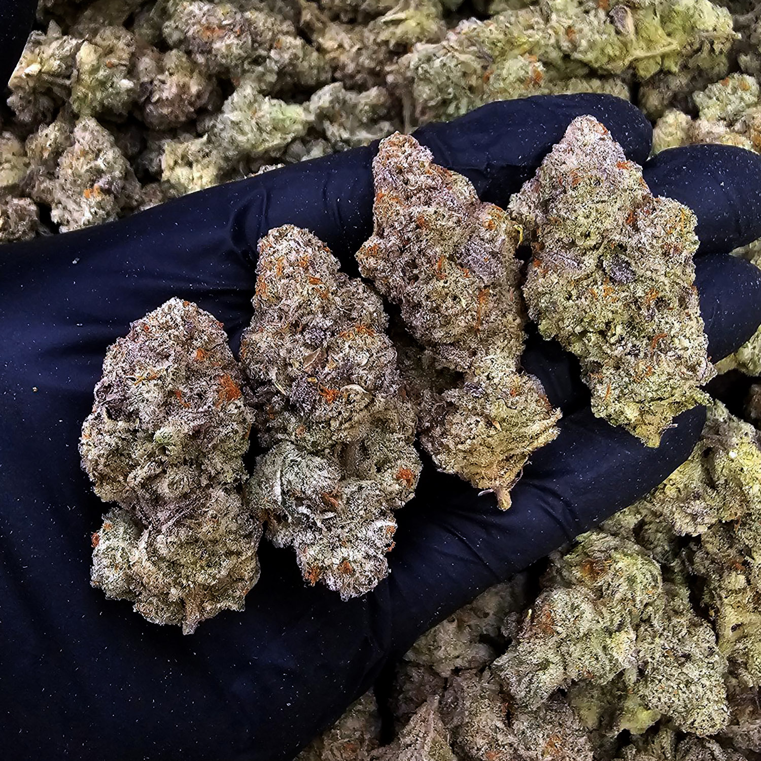 Appearance: Elongated buds, green with purple accents, orange pistils, heavy crystal trichomes