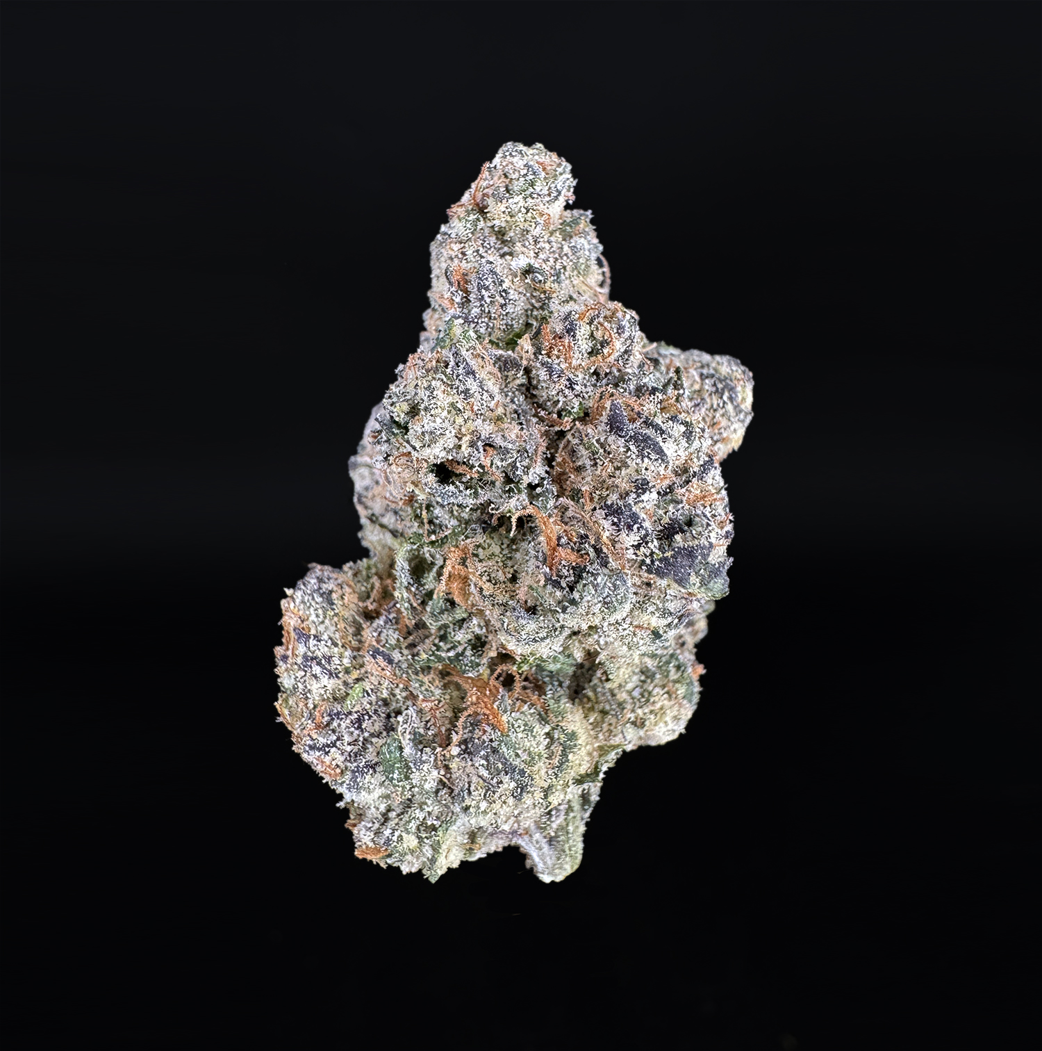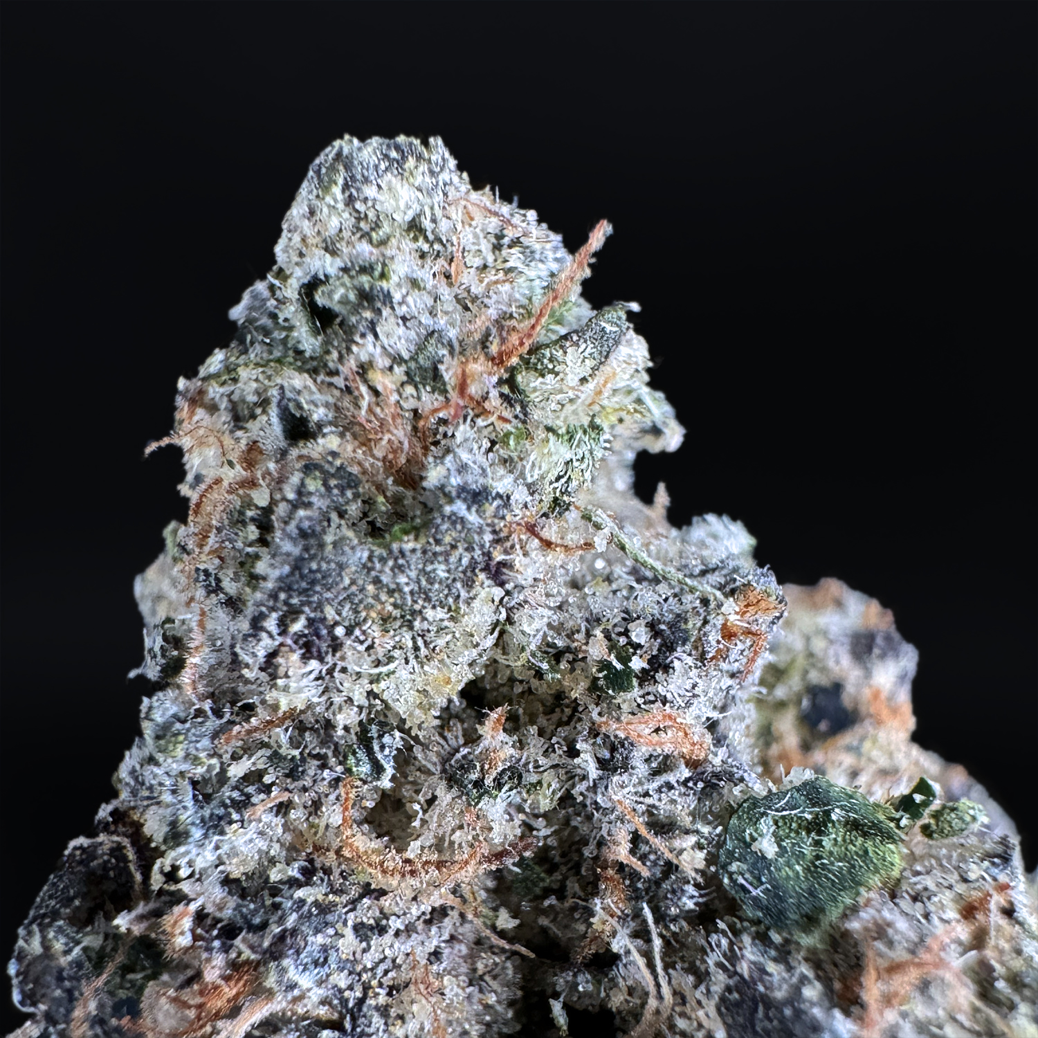 Appearance: Neon-green rounded buds, dark leaves, orange hairs, heavy white trichome coverage