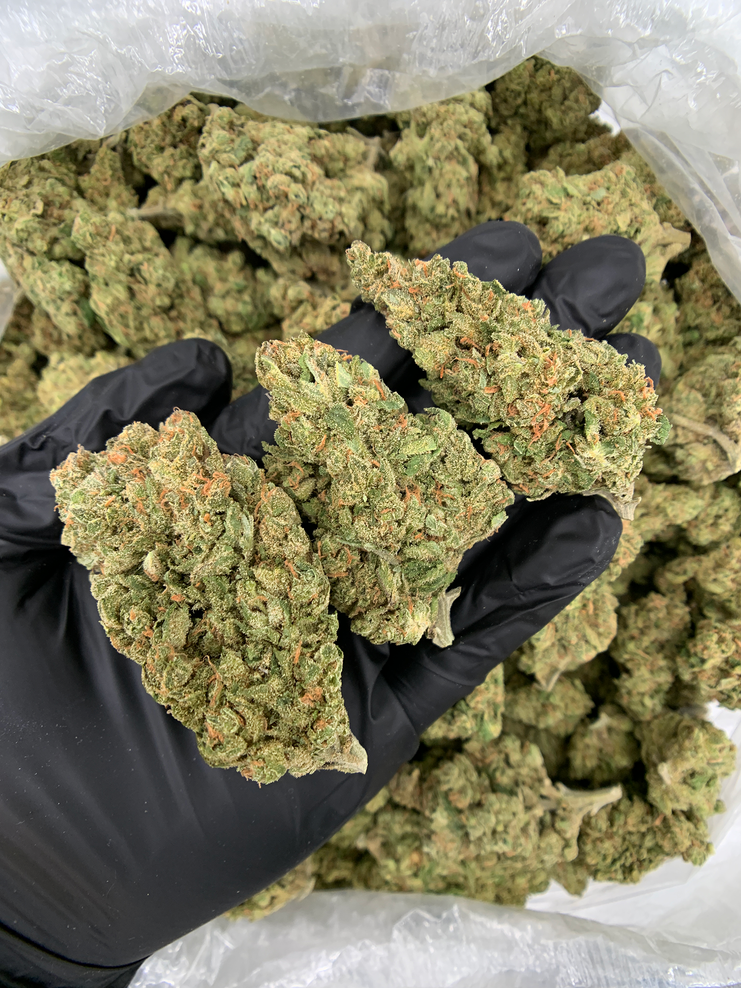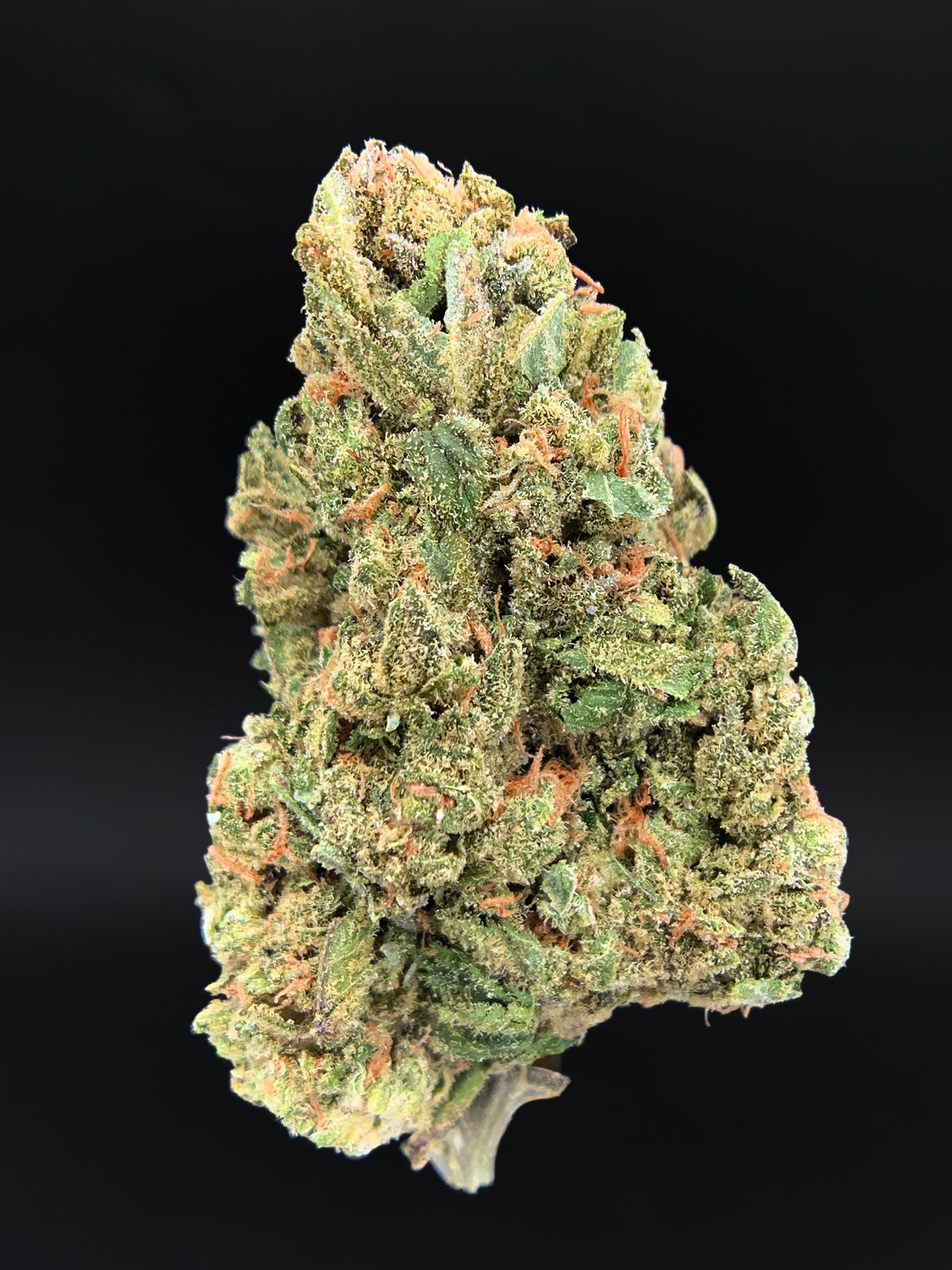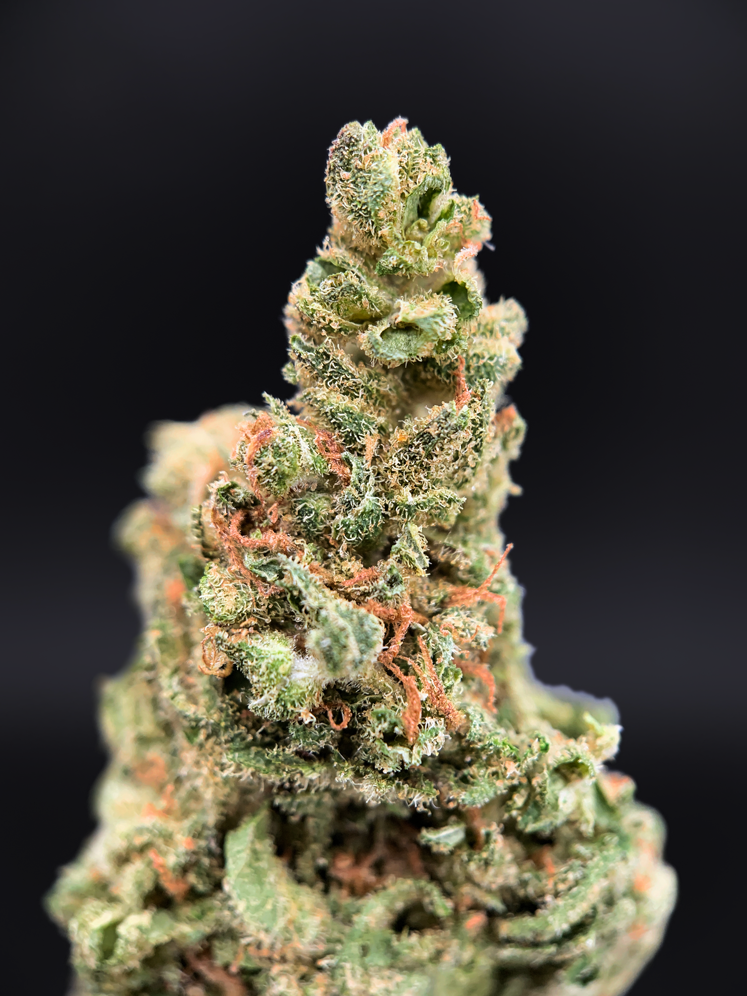 Visually, the buds are dense and resin-coated, displaying dark olive green tones accented by subtle purple undertones and amber hairs. A sticky layer of trichomes coats the surface, giving the flower a slightly glossy, terpene-rich appearance.