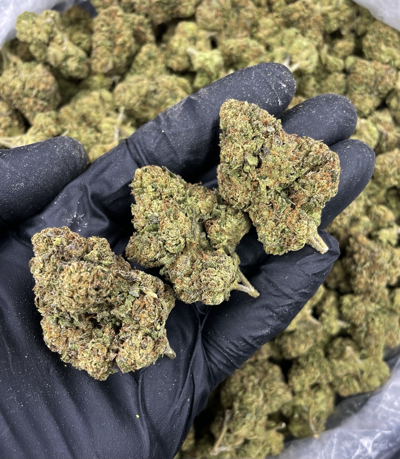 Appearance: Dense, frosty forest-green buds with amber pistils and heavy trichome coverage