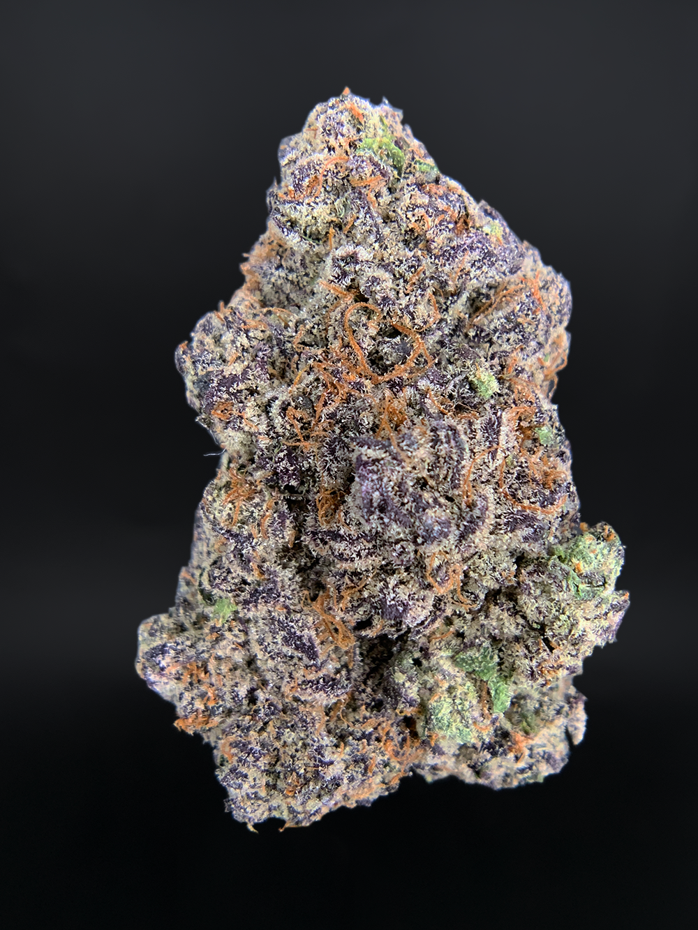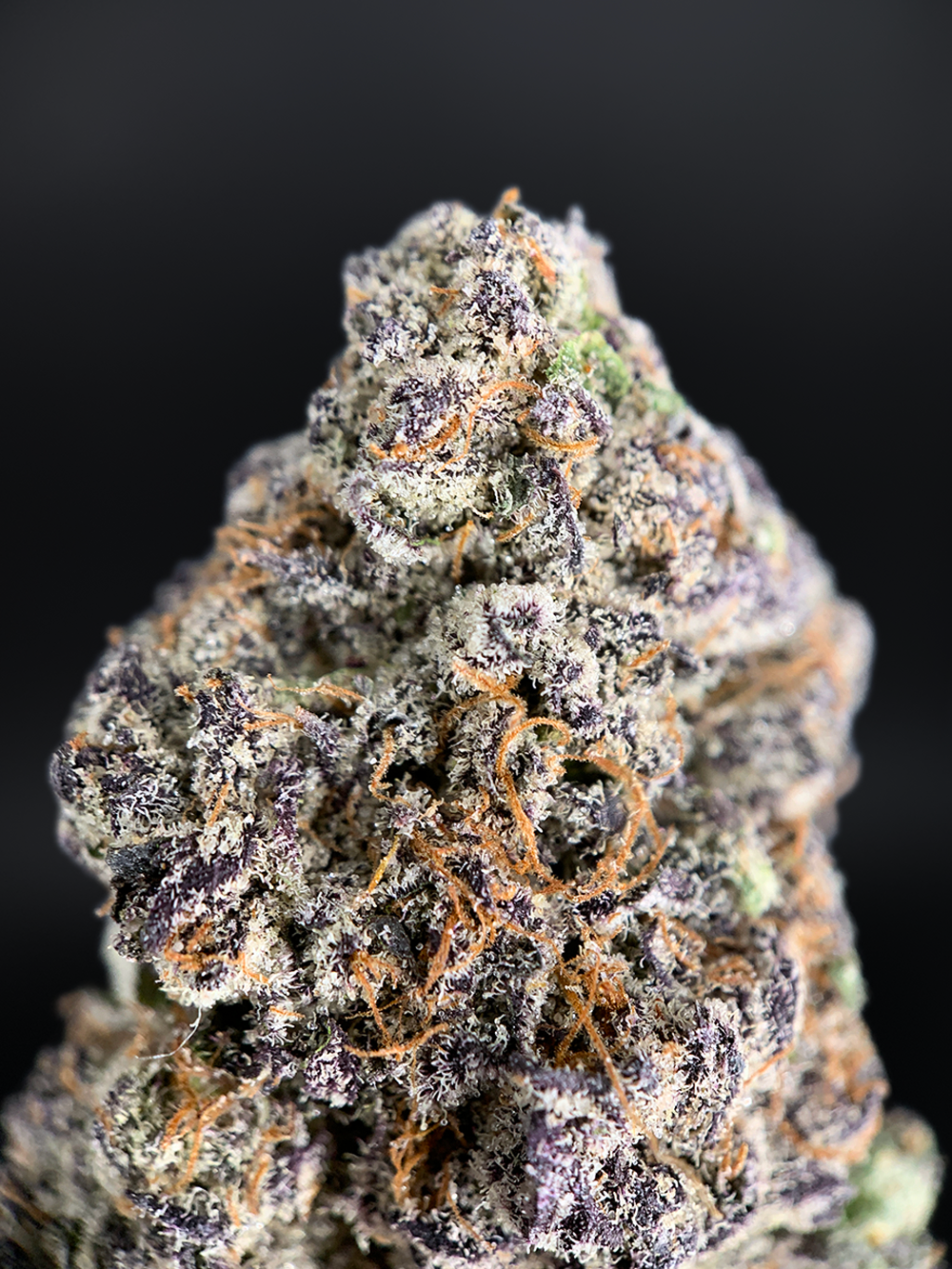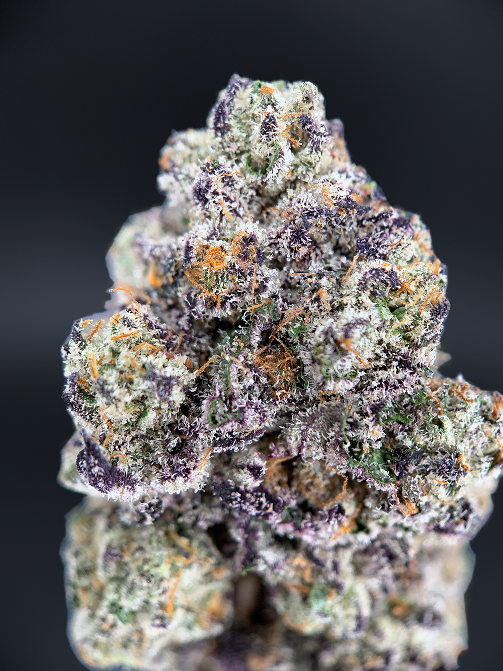 Appearance: Dense, spade-shaped olive-green buds with deep purple undertones; thin orange pistils; heavy “sugar-coated” trichome frost.