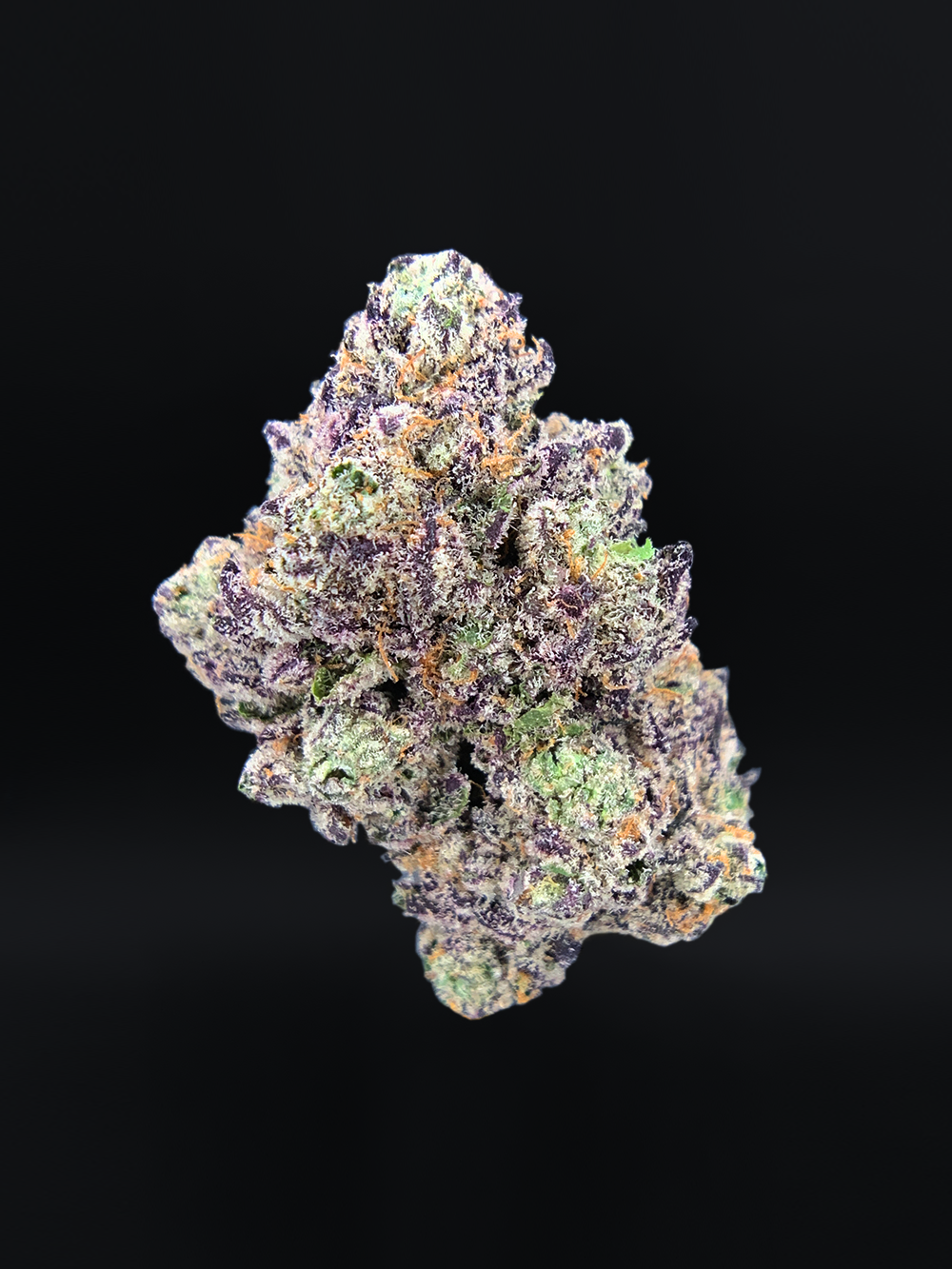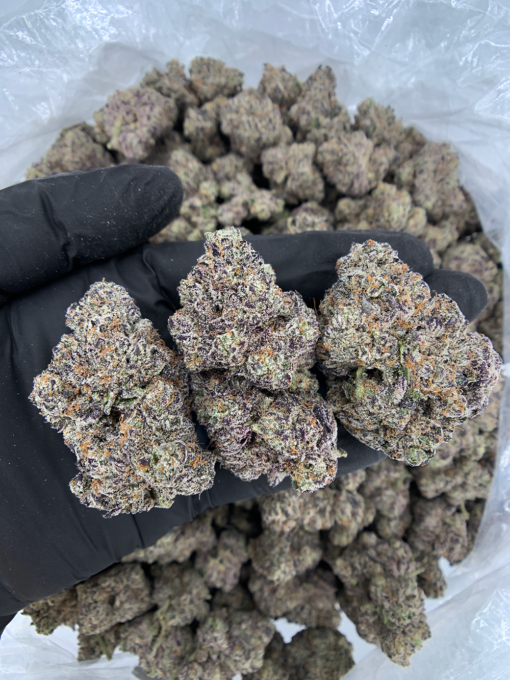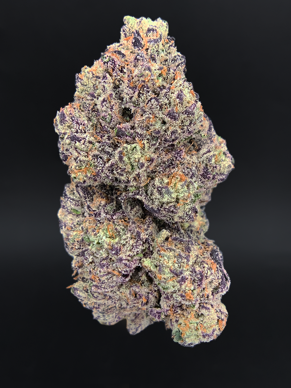 Appearance: Dense, spade-shaped olive-green buds with deep purple undertones; thin orange pistils; heavy “sugar-coated” trichome frost.